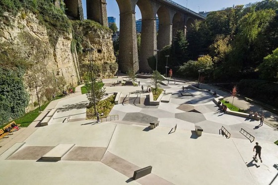 為了使公園充分融入場地所在的歷史環境,滑板設計師對幾何形態重新進行了闡釋,這體現在場地周圍的長凳和臺階上。石墻和長凳的表面被結合為一個整體,使滑板公園的邊界融入了附近建筑物的圍墻。